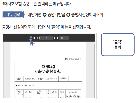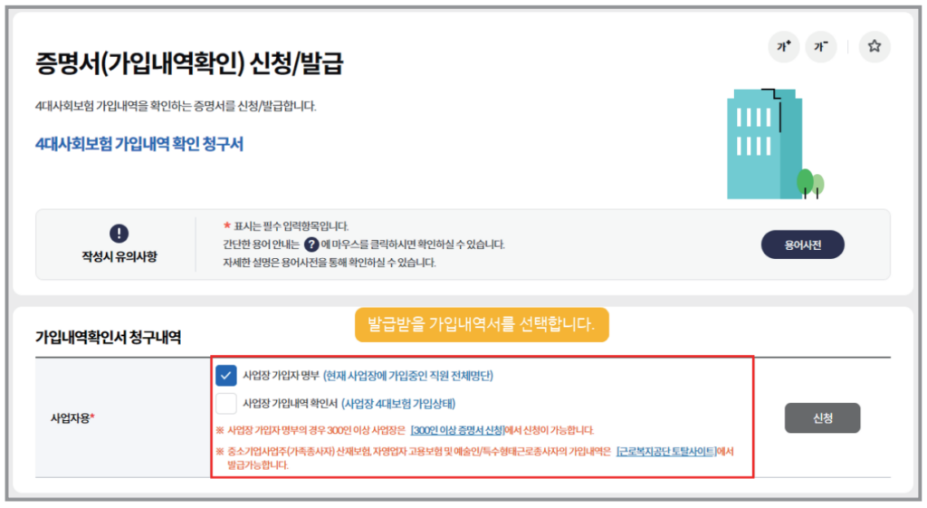 ※ 증명서 발급 시 유의사항 : 사업장 및 개인 가입내역확인 서비스는 현재 시점의 가입내역만 확인가능합니다.